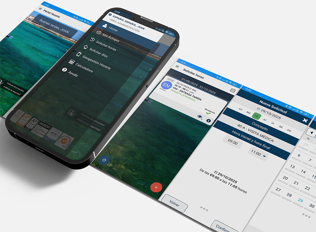 A través de la aplicación web "Portal Horario©", disponible en varios idiomas y con distintas funcionalidades en función del rol con el que se accede (usuario básico o gestor con hasta 3 diferentes niveles de revisión) podrá: